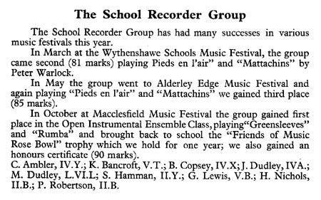 Recorder Group 1963 This talented group of Poundswickians honed its skills under the tutelage of Poundswick's first Music Master, Mr. F. P. Welton. The photograph was taken at the Alderley Edge Music Festival in May 1963.
